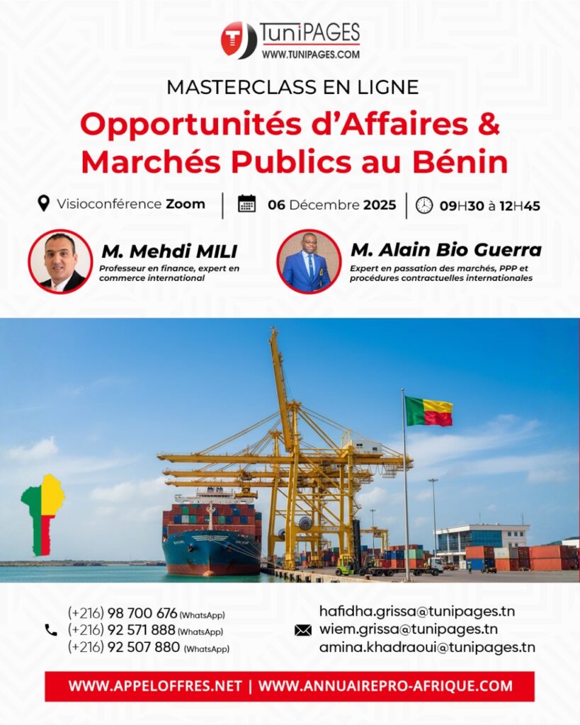 Masterclass en Ligne Opportunités d’Affaires & Marchés Publics au Bénin Date : Mardi 9 décembreHeure : 09h30 → 12h45 (Heure Tunis / Cotonou)Format : visioconférence Zoom